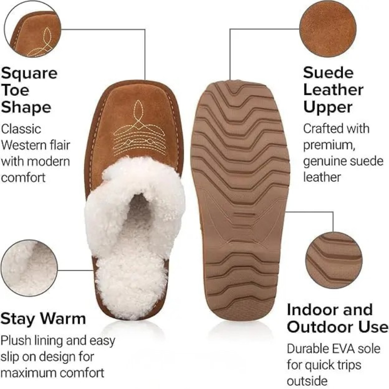 Jackie Square Front Suede Slipper is designed for everyday wear when you want a slip-on style that feels cozy indoors and remains practical for quick steps outside. The square front shape gives the slipper a structured, western-inspired look while keeping the overall profile easy to pair with lounge sets, denim, and casual layers. Jackie Square Front Slipper features a suede upper that adds a soft, textured finish and helps the slipper keep its shape through regular use. Inside, plush lining creates a warm feel and adds comfort for daily routines such as mornings at home, light housework, or winding down in the evening.